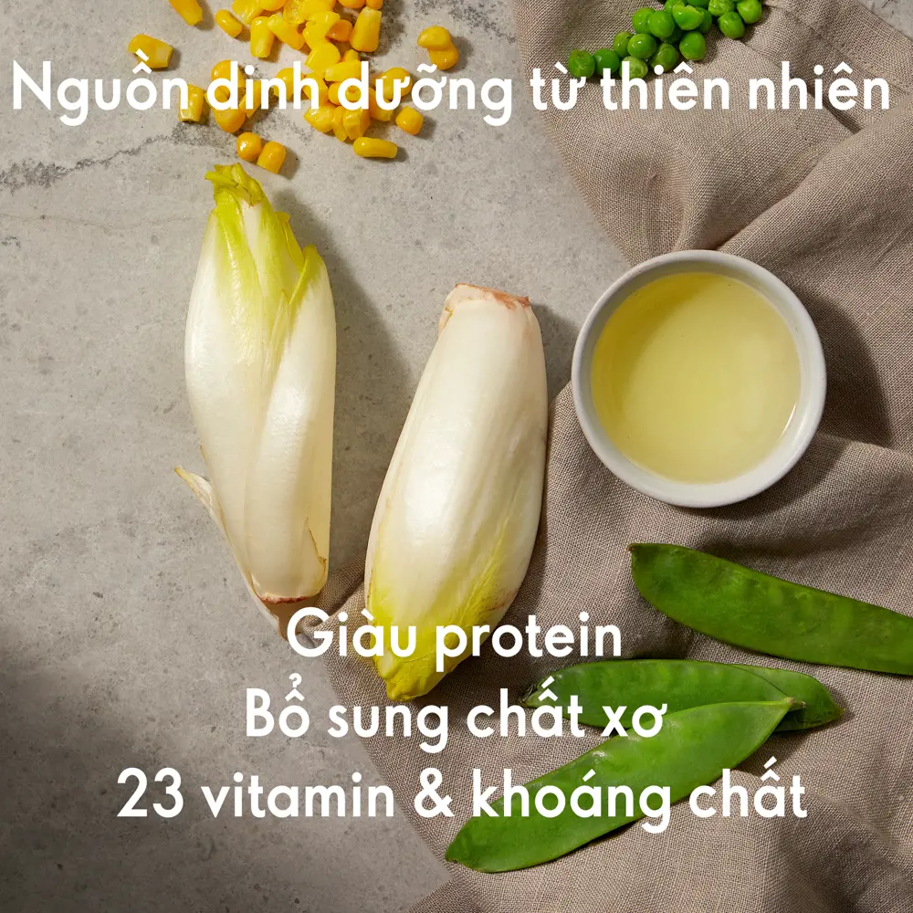 Protein Đậu Hà Lan (pisum sativum L.) (41,7%), Protein Đậu Faba cô đặc (vicia faba L.) (18%), Hỗn hợp vi chất dinh dưỡng (Muối kali của acid phosphoric, Calci cacbonat, Oxyd magnesi, Muối calci của acid phosphoric, Sắt furmarat), Resistant dextrin, Inulin (6,5%), Hương tự nhiên, Dầu hướng dương, Lecithin từ hướng dương, Chất làm dày (Gôm gua, Gôm xanthan), Hỗn hợp vi chất dinh dưỡng (acid ascorbic-L/Vitamin C, DL- alpha-tocopheryl acetat/Vitamin E, Kẽm sulfat, Nicotinamid/Vitamin PP, Retinyl acetat/Vitamin A, Mangan sulfat, Phylloquinon/Vitamin K, Calci-D-pantothenat/Vitamin B5, Natri selenat, D-biotin, Đồng sulfat, Cyanocobalamin/Vitamin B12, Kali iodid, acid Pteroylmonoglutamic/acid folic, Ergocalciferol/Vitamin D, Pyridoxin hydroclorid/Vitamin B6, Riboflavin/ Vitamin B2, Thiamin mononitrat/Vitamin B1), Chất tạo ngọt tự nhiên (Steviol glycosid từ stevia/ đường cỏ ngọt stevia)