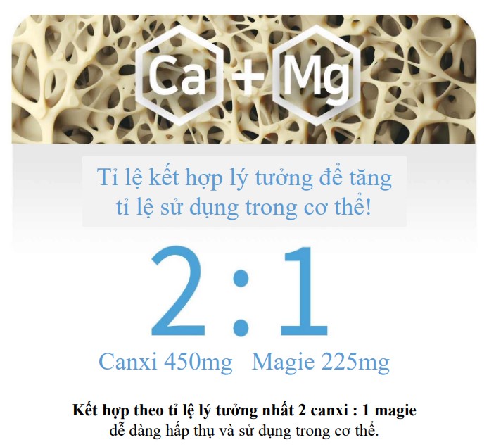 Canxi và magiê luôn cần nhau để hấp thụ, tỉ lệ lý tưởng hấp thụ canxi và duy trì cân bằng khoáng chất là 450mg canxi - 225mg magie