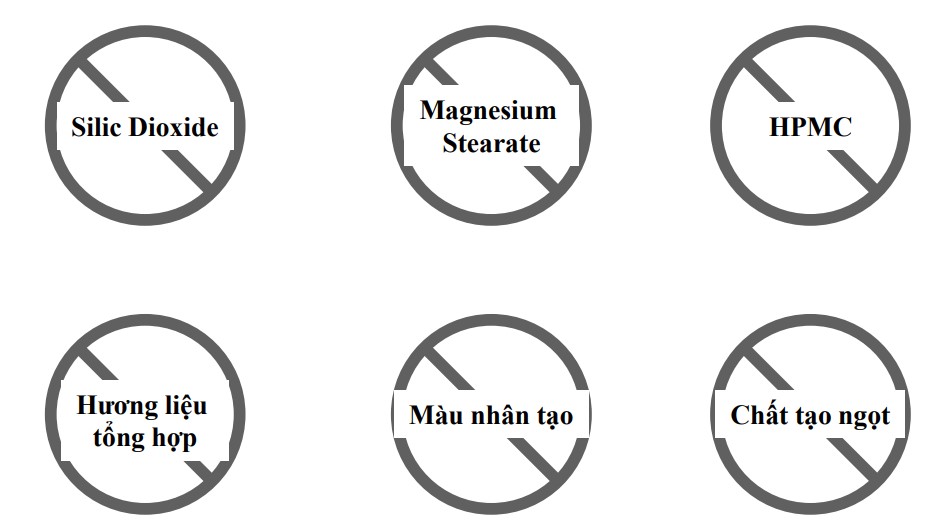 Không sử dụng tá dược hóa học (silic dioxide, magnesium stearate, HPMC (hydroxypropylmethyl cellulose) và chất phụ gia tổng hợp (hương liệu tổng hợp, phẩm màu, chất tạo ngọt) tạo hương vị, màu sắc và mùi vị cho sản phẩm