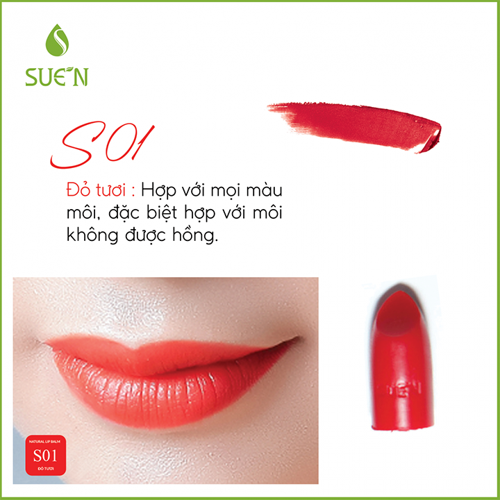 Đỏ tươi là gam màu bình dân phù hợp với nhiều tông da khác nhau. Son môi cao cấp Sue'N 01 đỏ tươi là dòng son được nhiều bạn trẻ và giới văn phòng yêu thích.