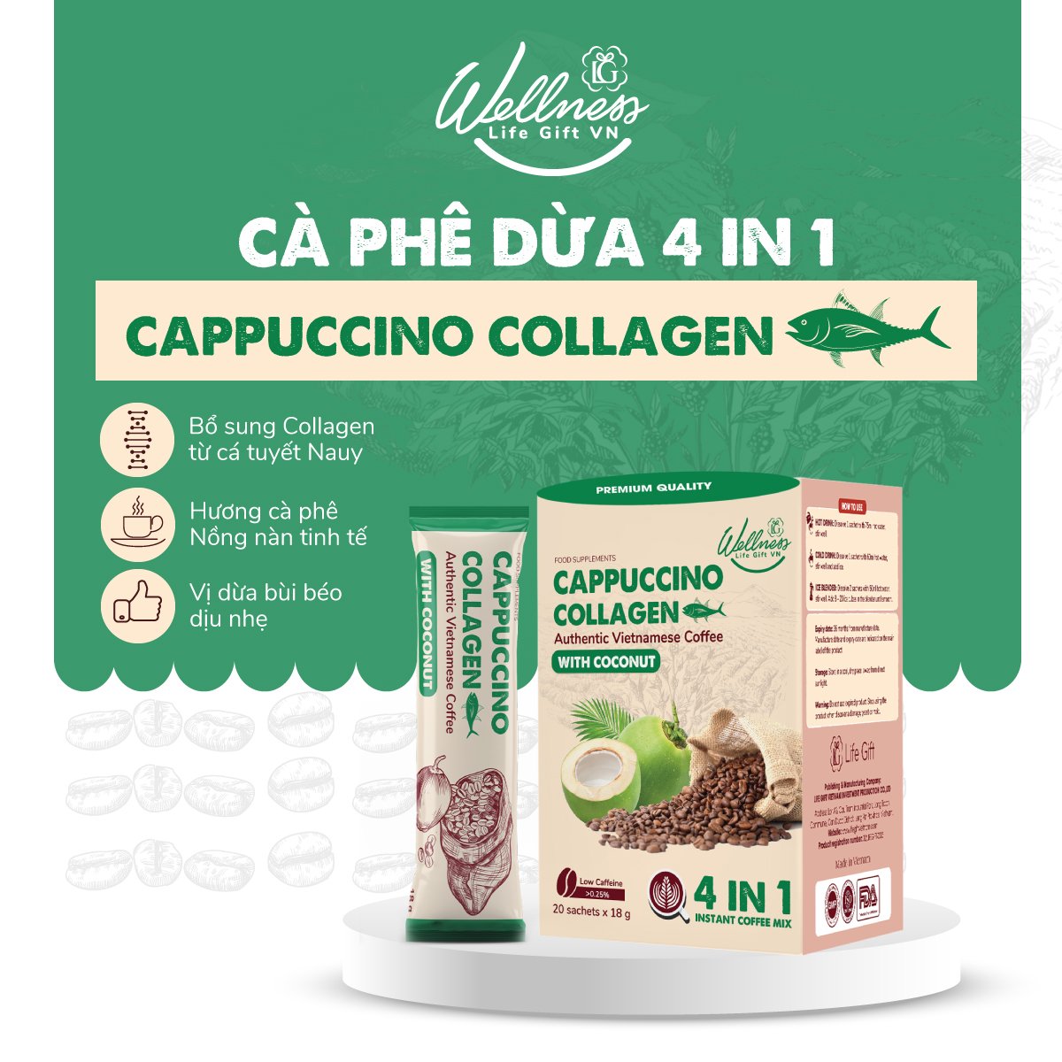 Cà Phê Cappuccino Collagen Vị Dừa là sự kết hợp hoàn hảo giữa vị bùi béo của dừa sánh quyện cùng hương cà phê nồng nàn, tinh tế không chỉ giúp cho tinh thần sảng khoái để bắt đầu một ngày mới thật năng động, lượng collagen nguyên chất được thêm vào sản phẩm còn hỗ trợ làm giảm quá trình lão hóa da, hỗ trợ tốt cho đường tiêu hóa