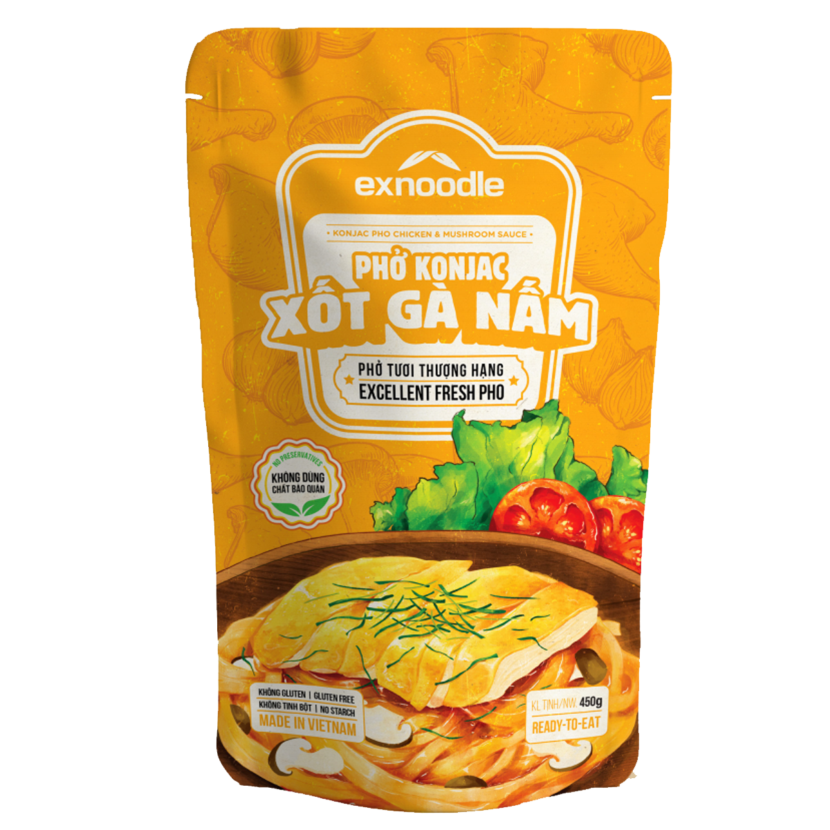 Sợi phở Konjac dai giòn sật sật ngấm vị thịt gà béo ngậy và vị nấm dịu mát tạo hương vị thơm ngon, lôi cuốn